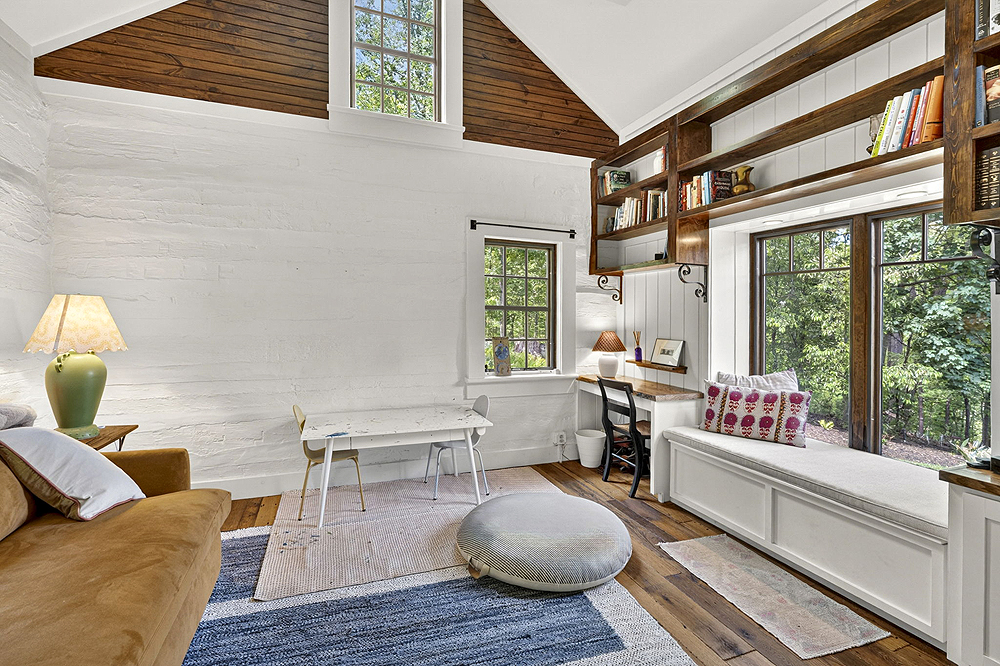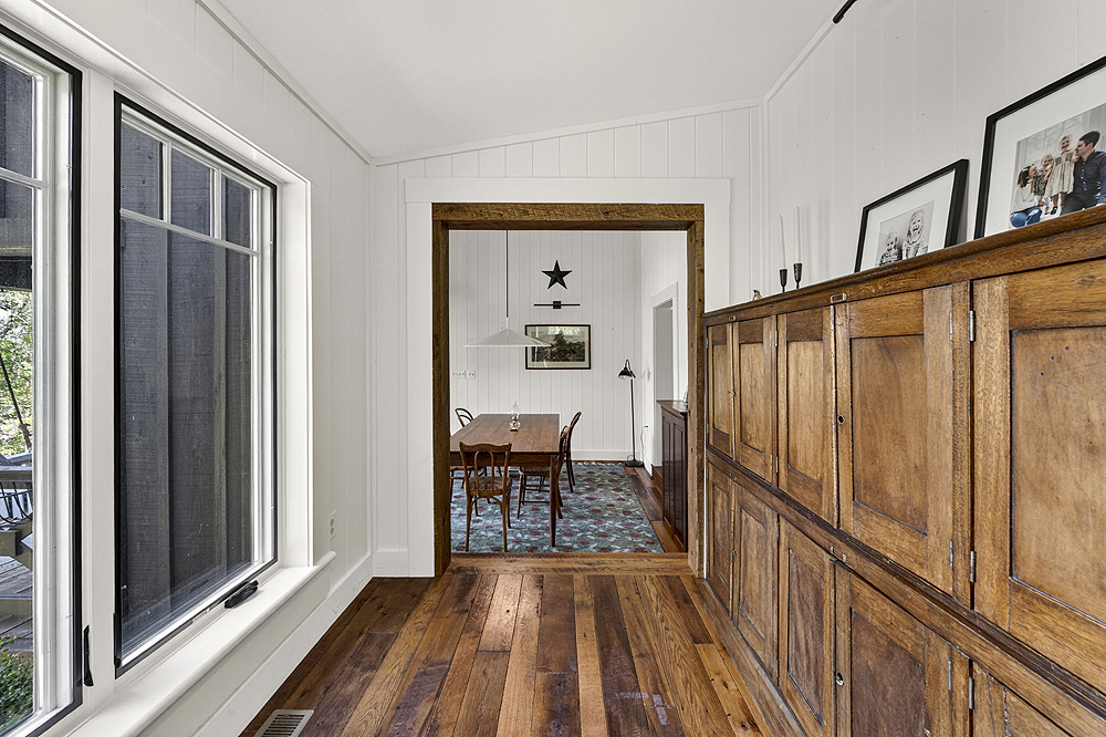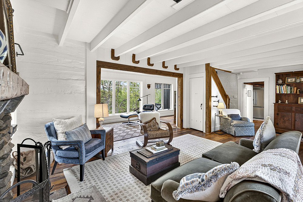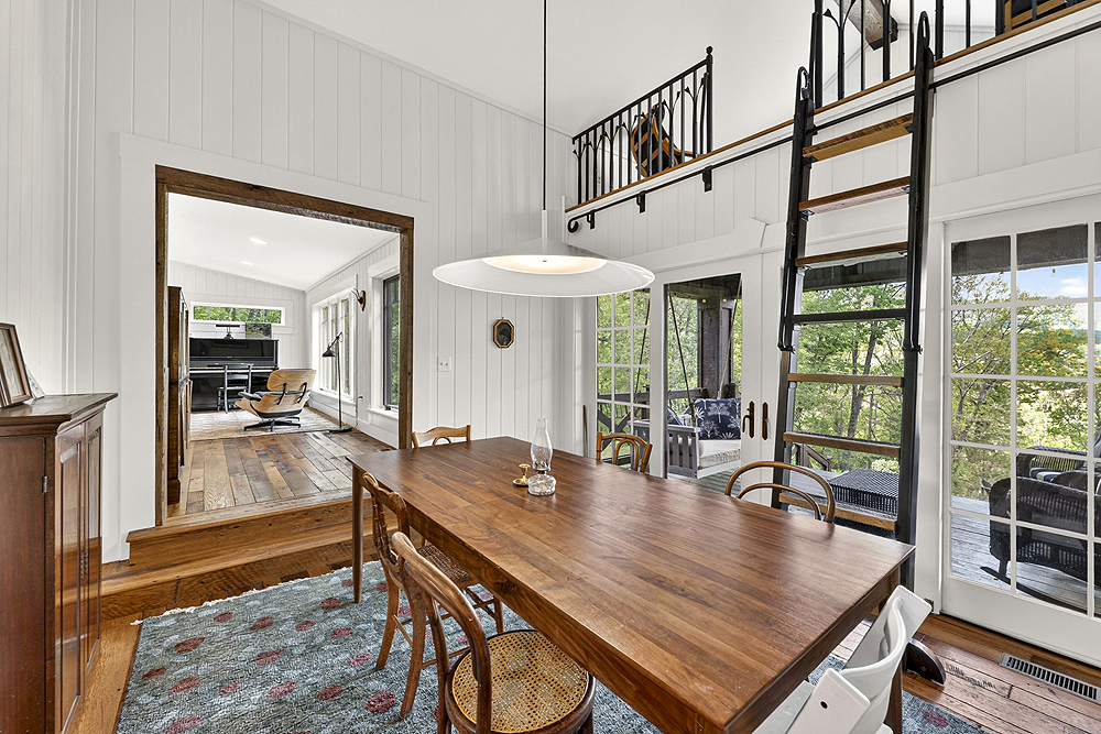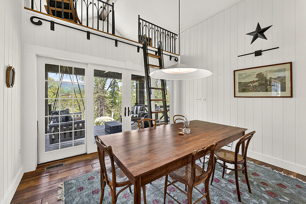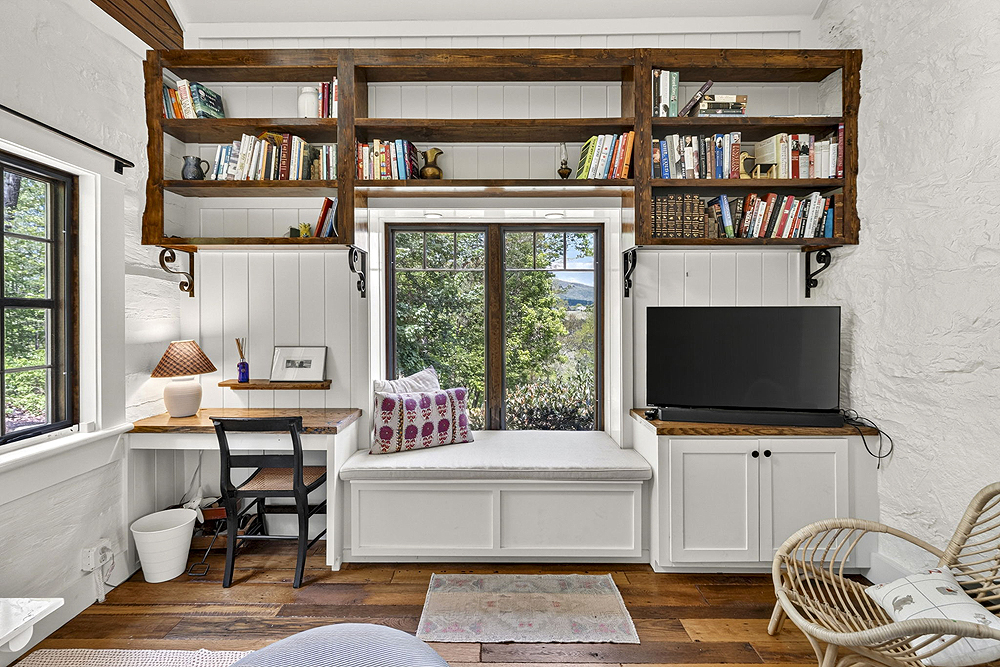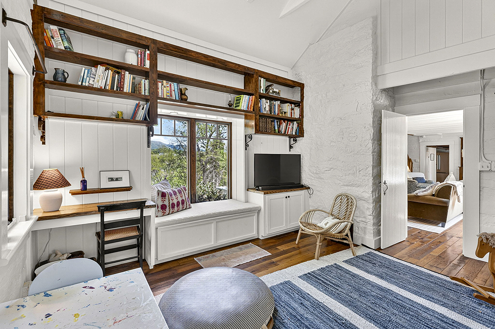 The artfully restored main cabin features indoor entertaining spaces that blend seamlessly with outdoor living areas. This comfortable home has plenty of space to unwind, enjoy the view, and even get a little work done in the library.