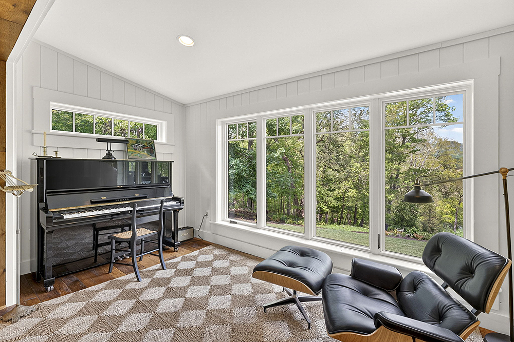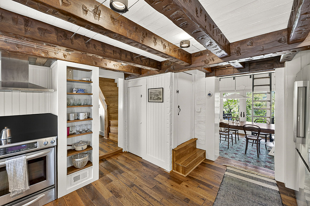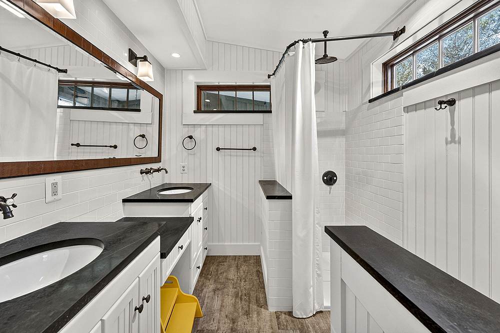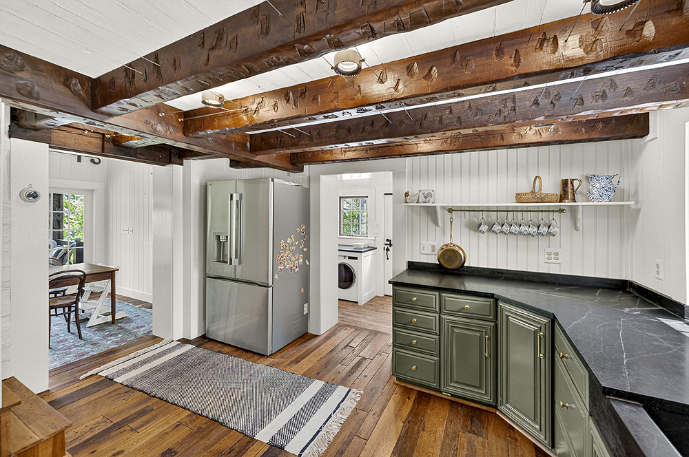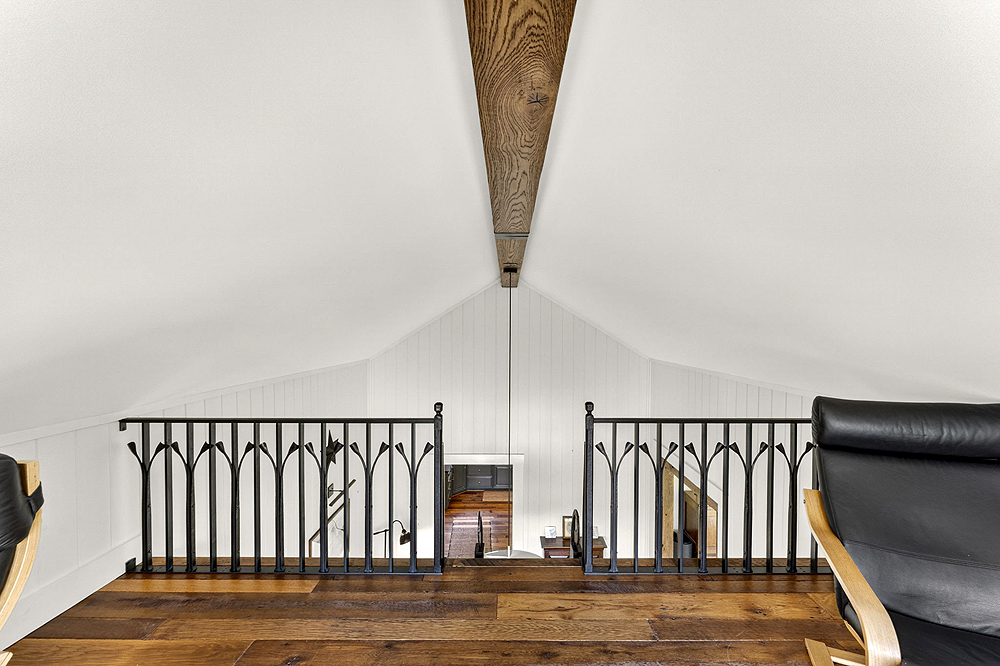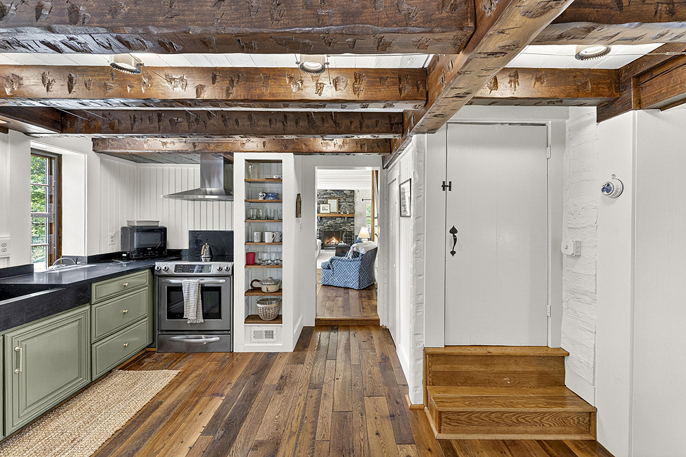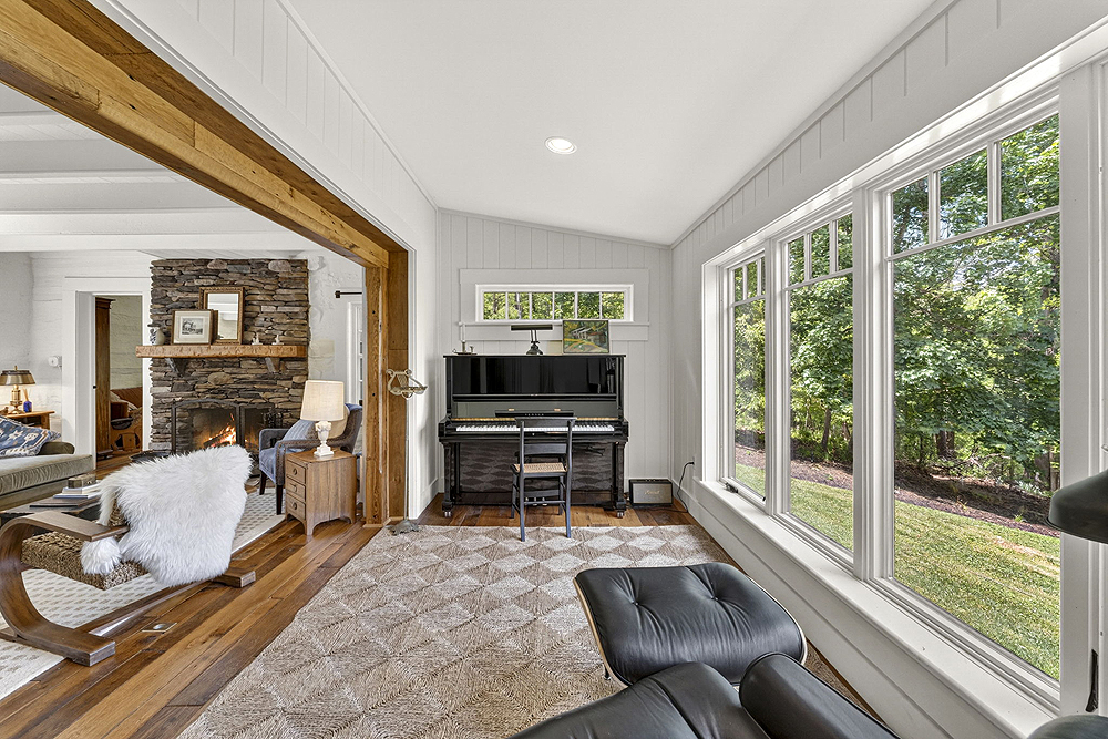 The artfully restored main cabin features indoor entertaining spaces that blend seamlessly with outdoor living areas. This comfortable home has plenty of space to unwind, enjoy the view, and even get a little work done in the library.