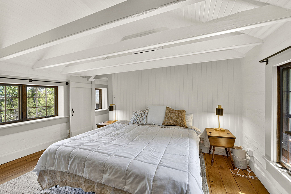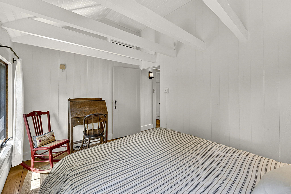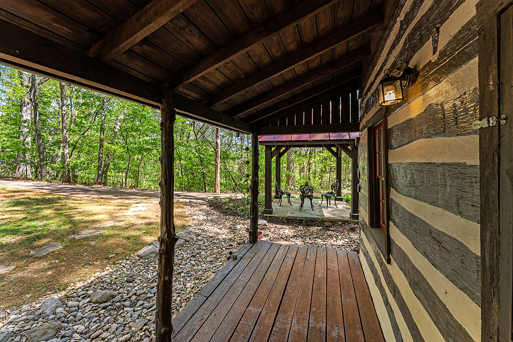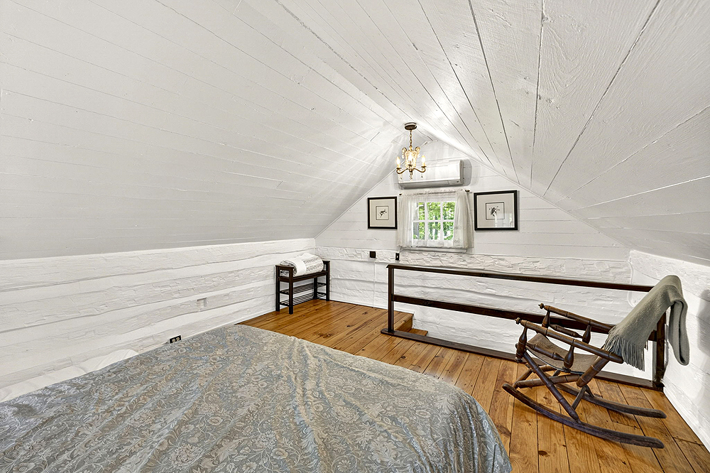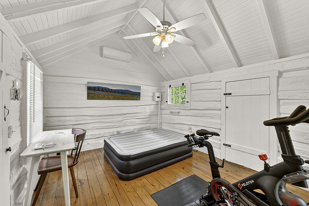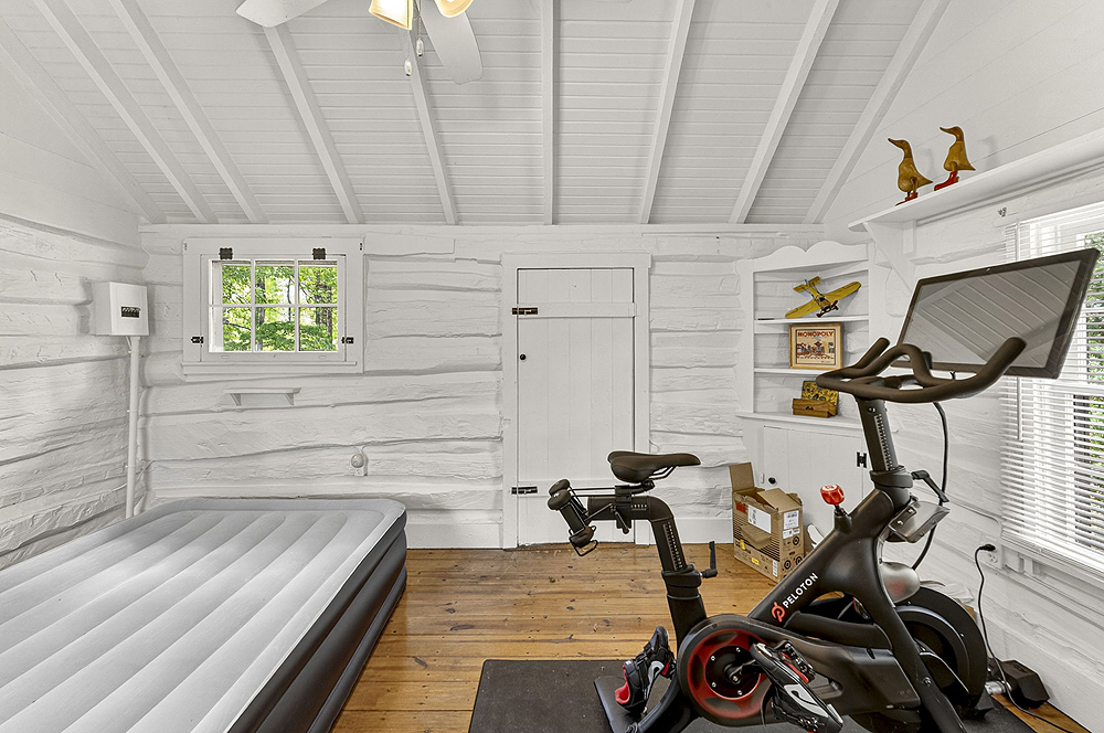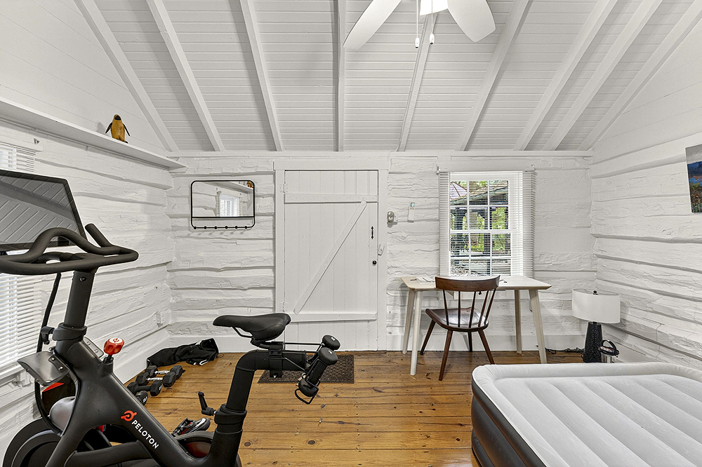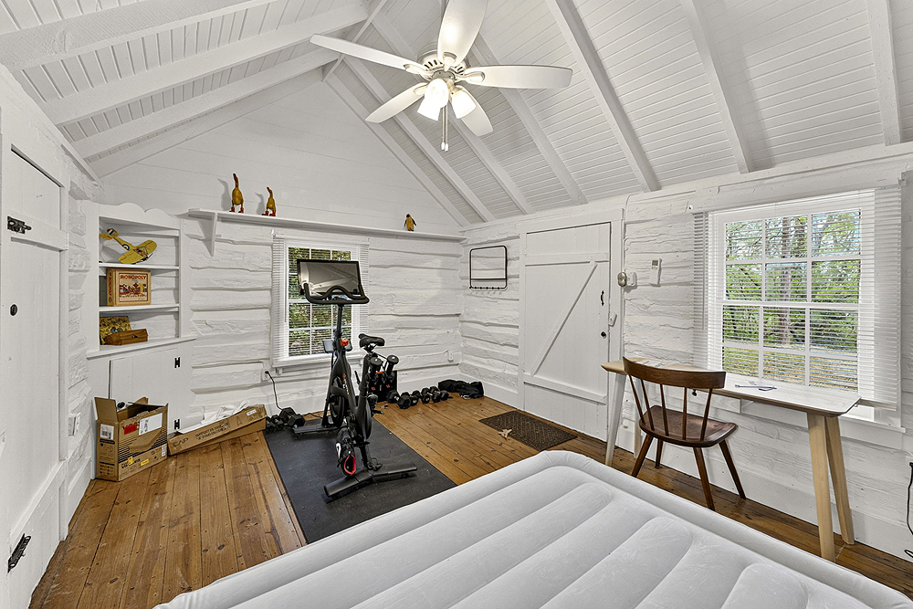 This one room space has white washed log walls, a mini-split for heating and cooling, and front and back entrance and a high cathedral ceiling with exposed beams. The perfect gym or yoga studio, but also easily converted into a studio bedroom unit as well.