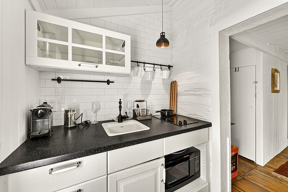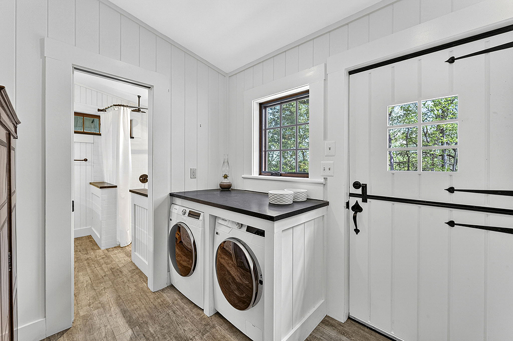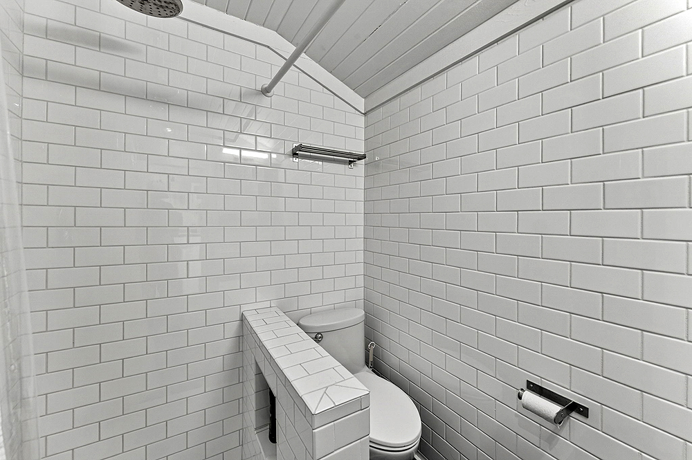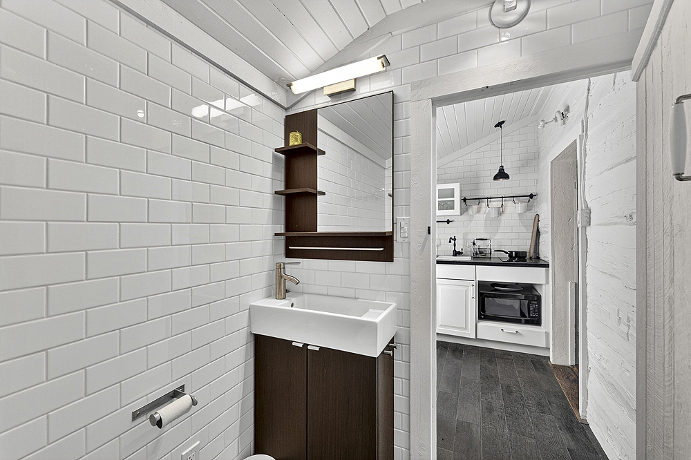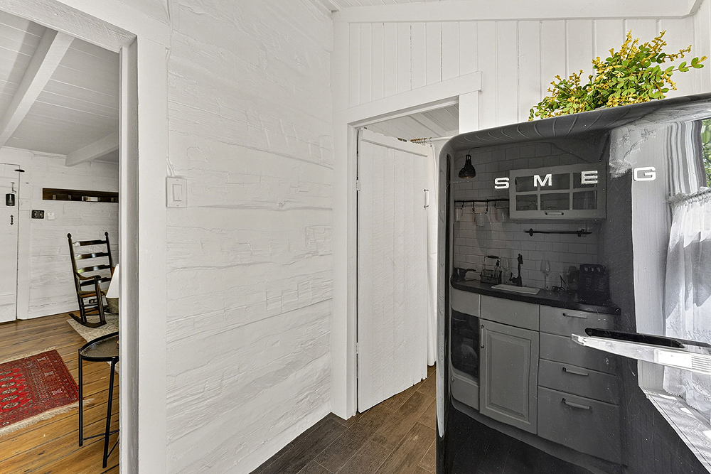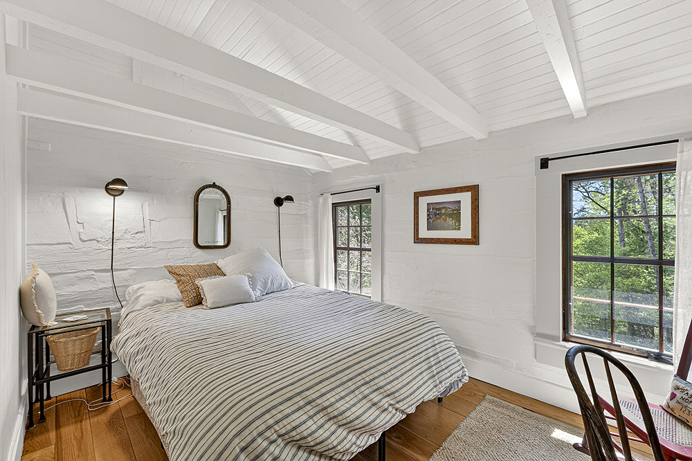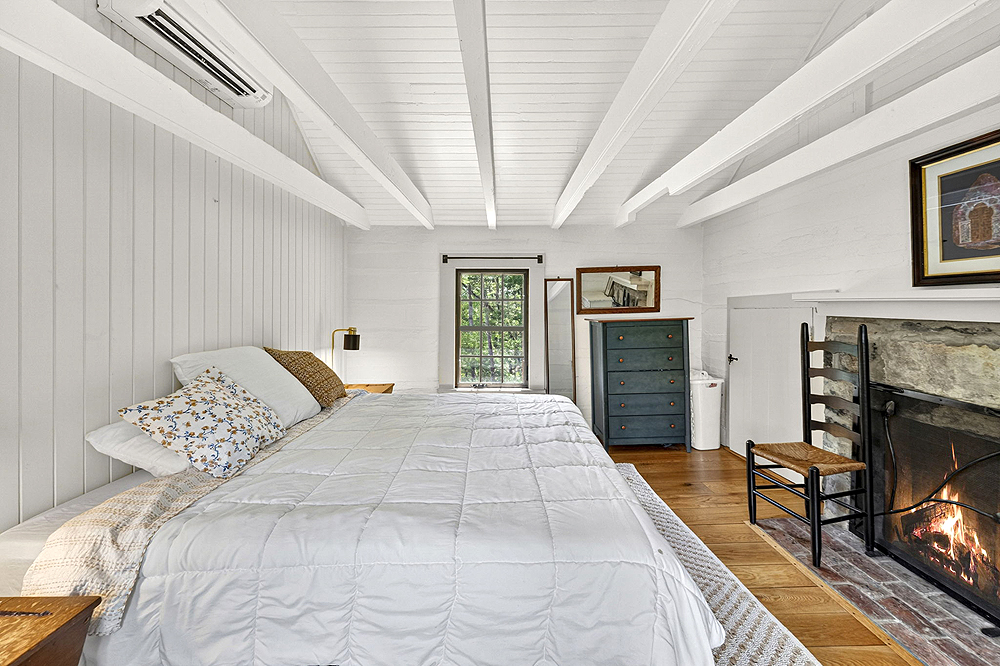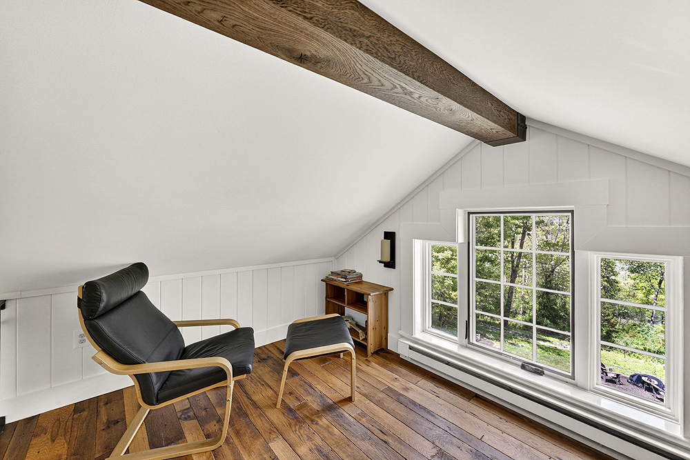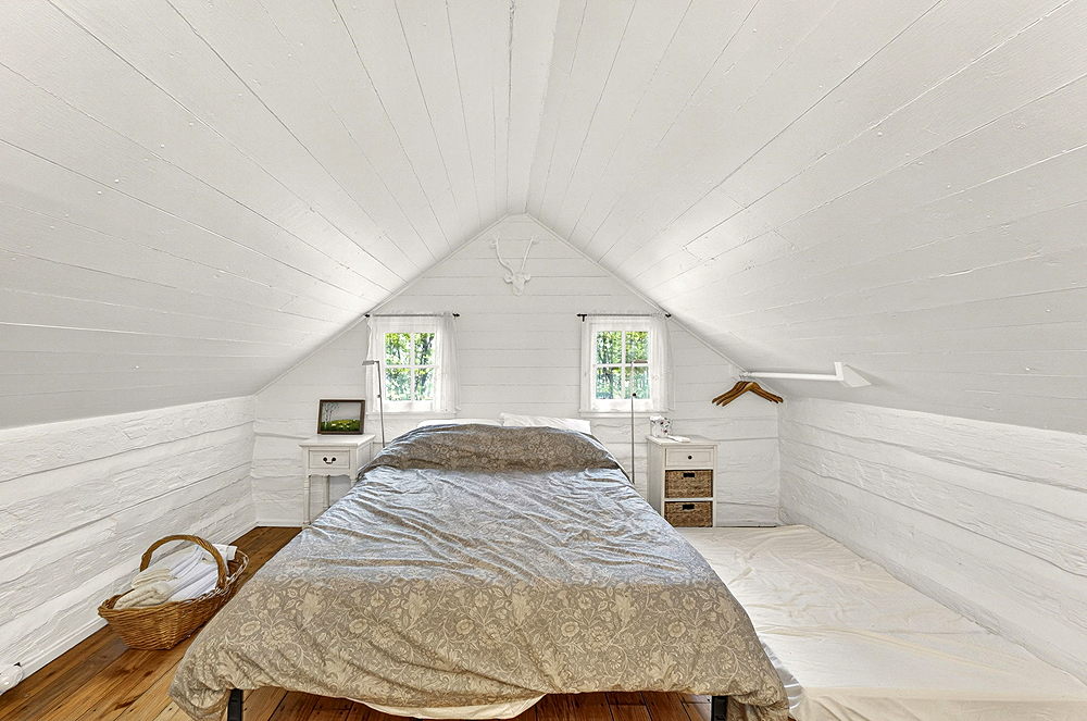 This one room space has white washed log walls, a mini-split for heating and cooling, and front and back entrance and a high cathedral ceiling with exposed beams. The perfect gym or yoga studio, but also easily converted into a studio bedroom unit as well.